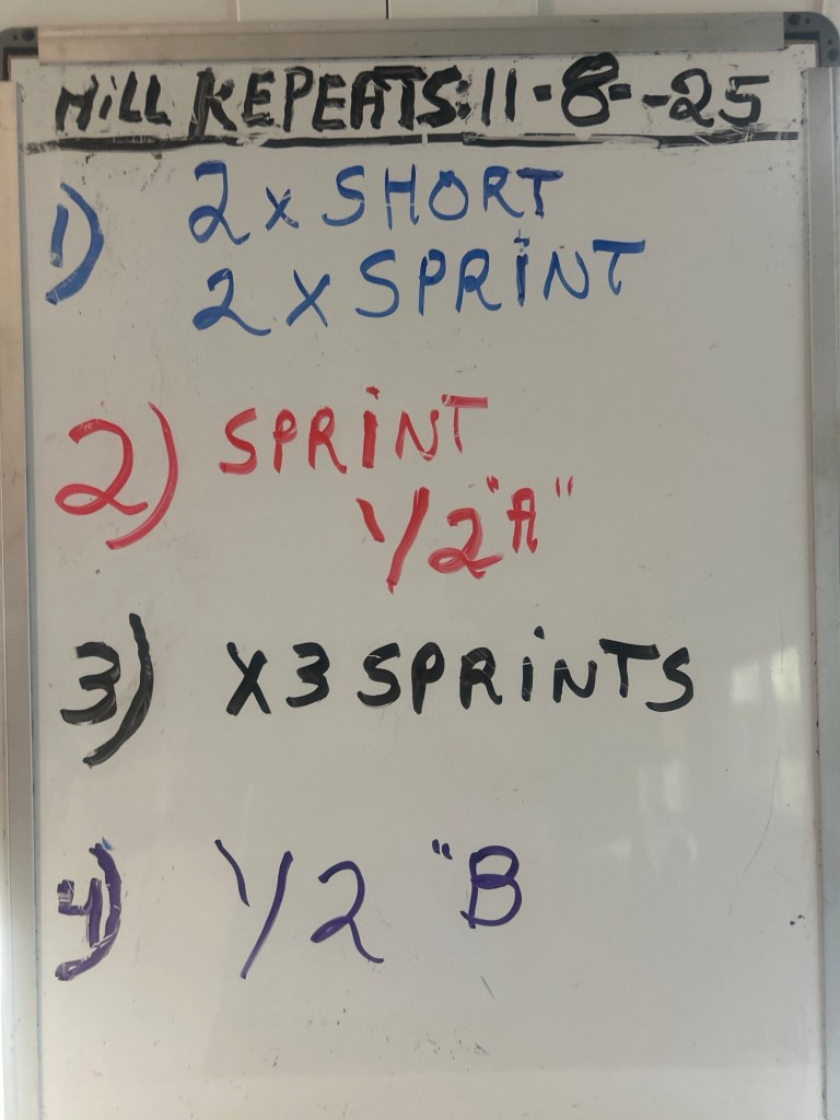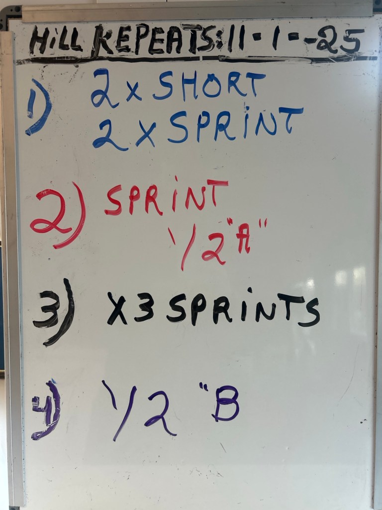 11/6/25 THURSDAY. SPEED-WORKat your local track. some of the group will meet in dirt PE parking lot at COM , 8 am for warm-up mile; then to track. A & B groups get in the 2 x 150 (50) stride-outs: