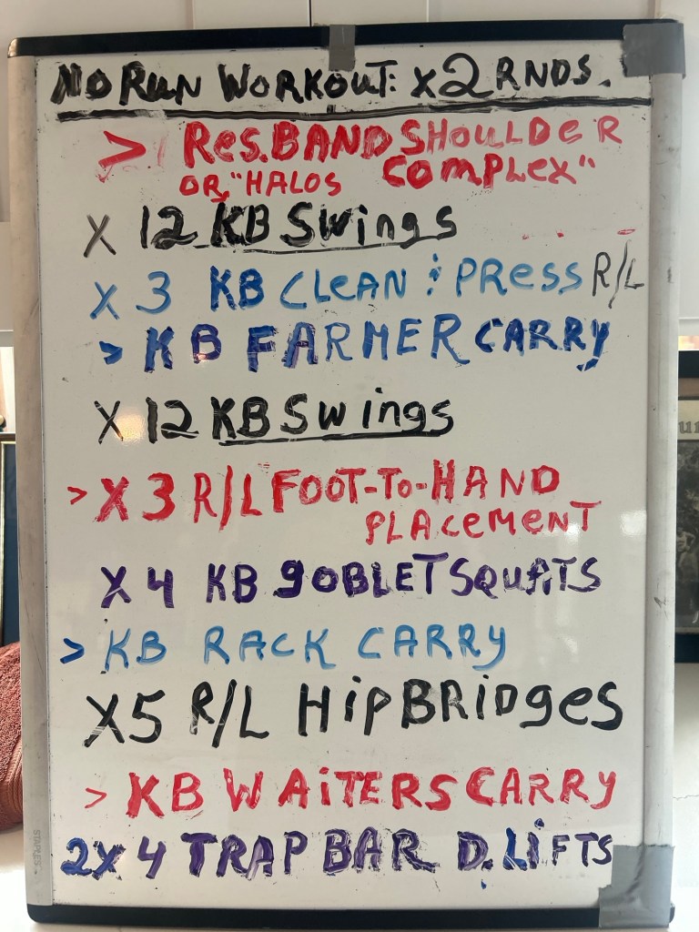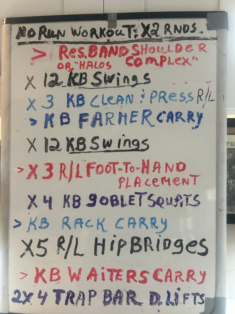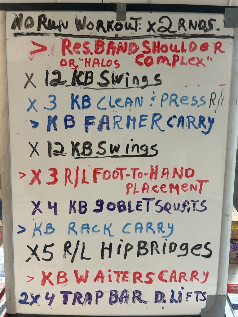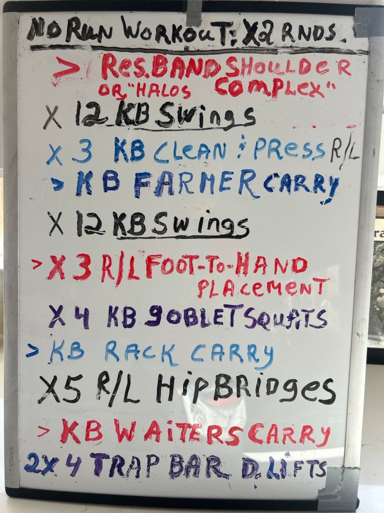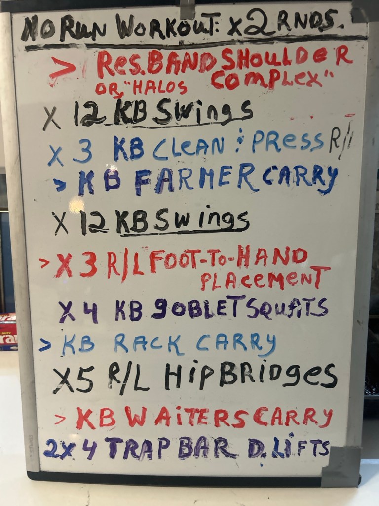 Looks like Tuesday, Wednesday, Friday and Saturday will be rain-free; some rain on Thursday. Saturday looks good for that all-around fitness session at the Seminary College. Note that the SATURDAY WORKOUT includes a solid workout for non-runners where you’ll learn mobility, strength , loaded carries, KB swings, KB Clean & Presses, Deadlifts and more to build a strong structural foundation for daily living and sports. The four exercise stations and hill repeats are on separate board from the second half of the workout.