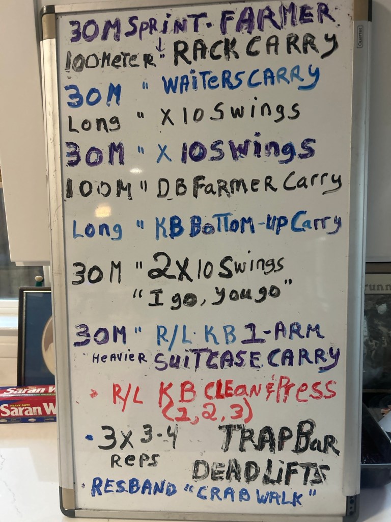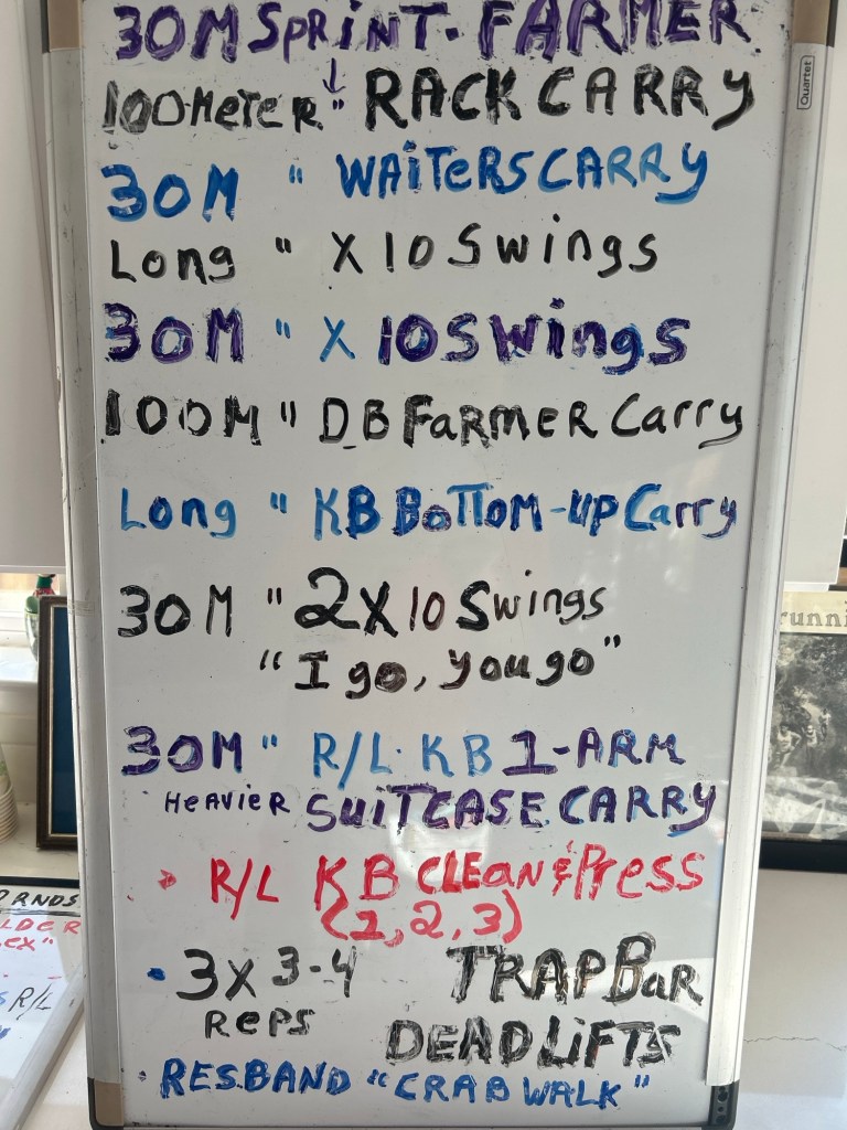 10/29/25 WEDNESDAY. STRENGTH TRAINING CIRCUIT/MOBILITY/SWINGS/LOADED CARRIES/KB LIFTS/DEADLIFTS.8 AM at Warren’s gym.