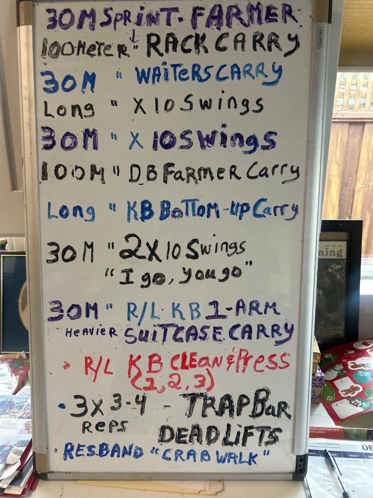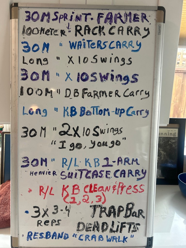 10-22-25 WEDNESDAY. STRENGTH CIRCUIT/MOBILITY/SWINGS/LOADED CARRIES. 8 AM at Warren’s. Get in your mobility warm-up drill: halos, shoulder complex, 5 goblet squats – and KB Swings.