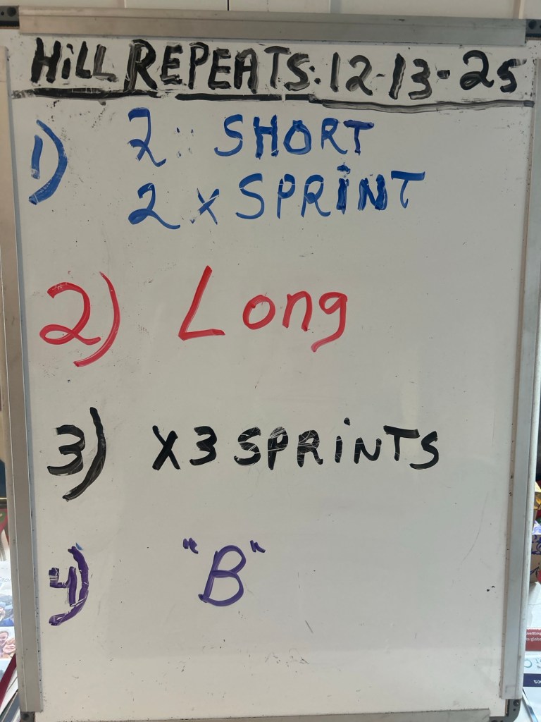 10/23/25 THURSDAY. SPEED-WORK at your local track. After the warm-up mile be sure to get in your skips, butt-kicks and 6 x 30 quick cadence pick-ups. Both A & B gps: 2 x 150 (50).