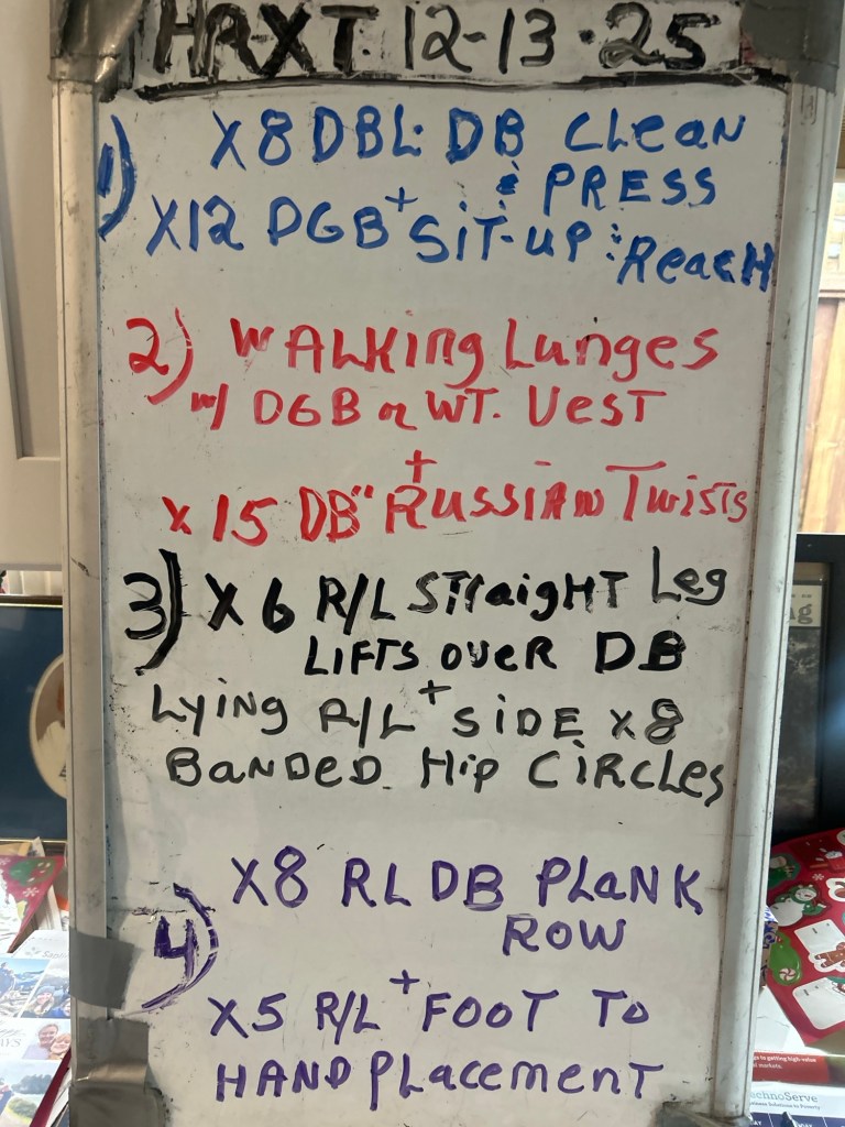 12/24/25 STRENGTH TRAINING...getting in your home workout should be doable. For example, do x 5 R/L One-Arm Gorilla Rows – X10 KB Swings – R/L X5 KB Clean to Front Squat to Overhead Thruster. Repeats for three rounds.