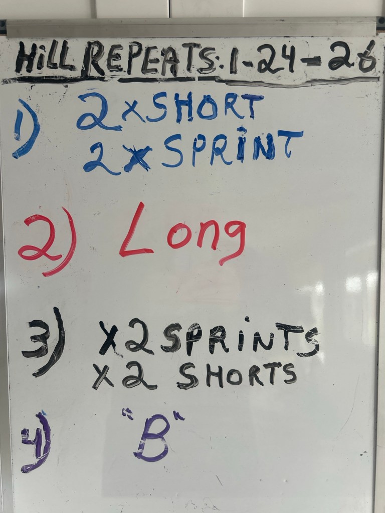 Danny/Ana: 2 x 150 (50) or 2 x 200 (2000 – 4 x 800 @5K pace (200 jog)…another 800 cool-down. Fewer reps due to your SF Marathon on 2/1/26…..( If you don’t end up running the half marathon on Sunday; run 14-15 miles)