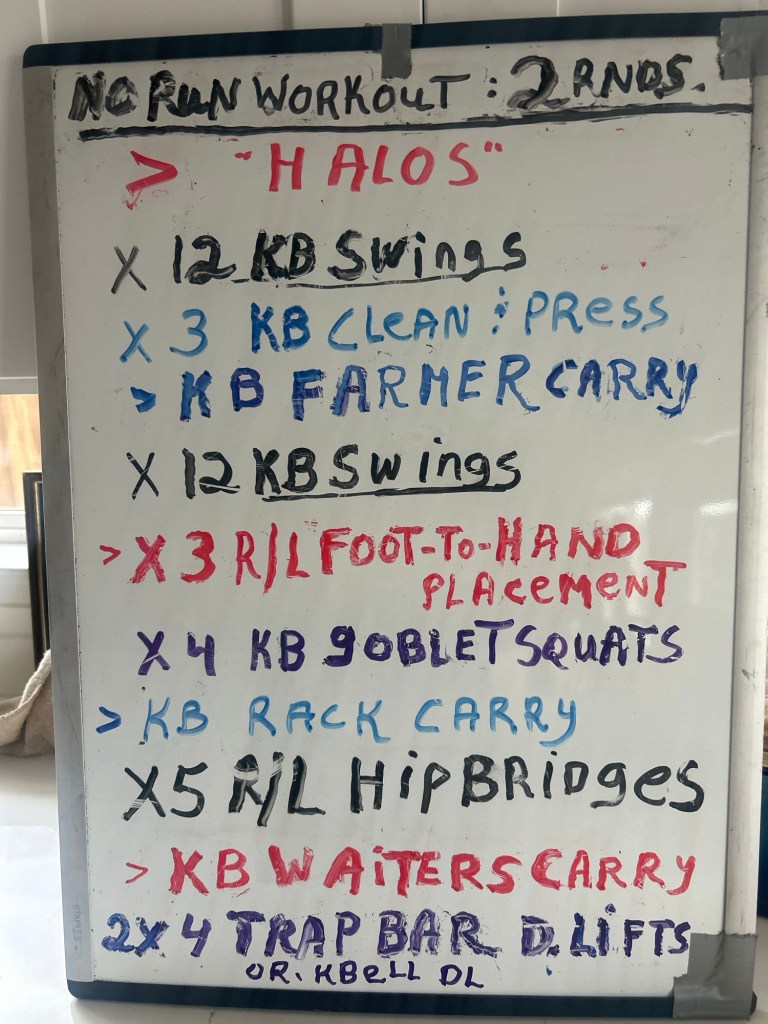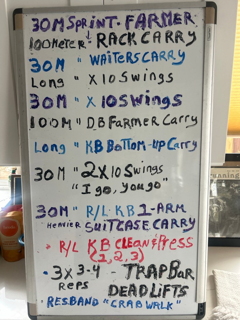 Plus whiteboards for non-runners with an all-around workout and learning the kettlebell basics, Loaded Carries and mobility work .