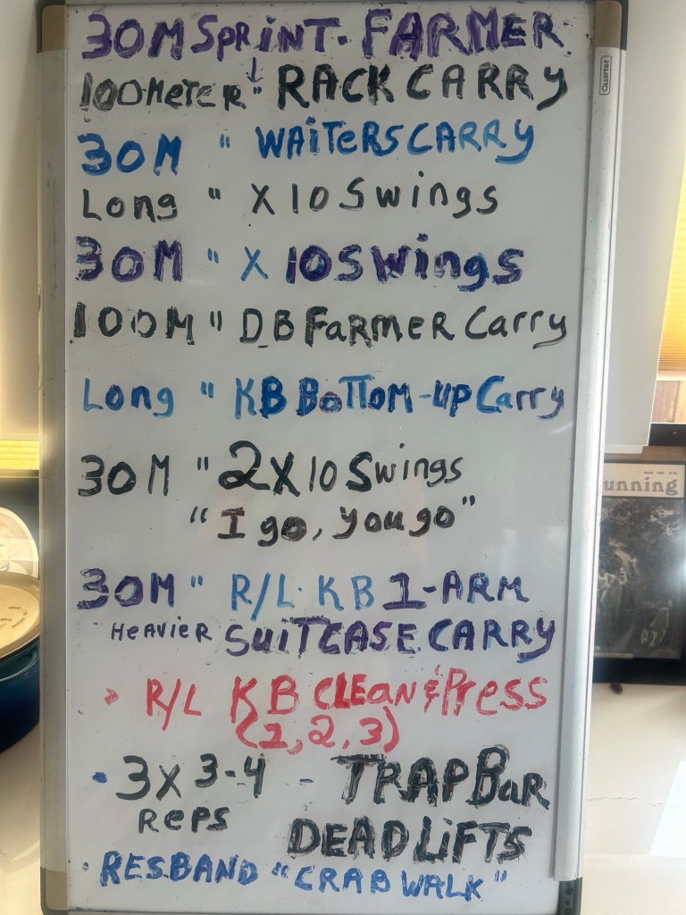 Then onto next white board with Sprints/Loaded Carries/Swings/deadlifts