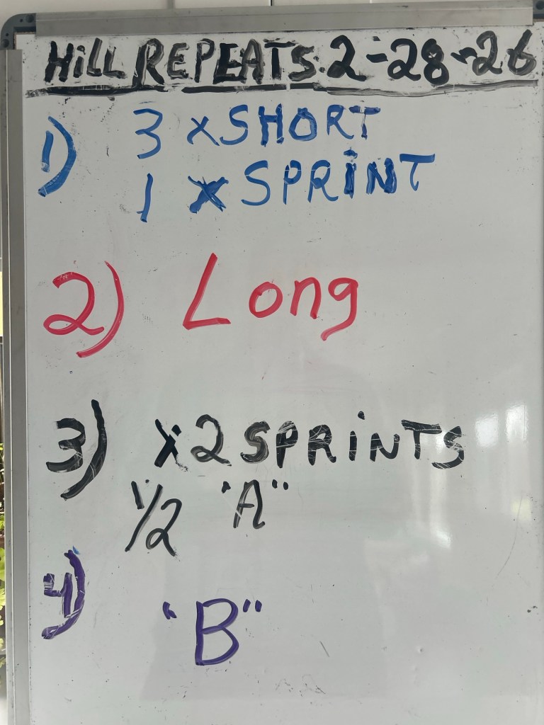 THURSDAY 2/26/26. SPEED-WORK at your local track. Some of our group use the COM track in Kentfield and meet for the warm-up in dirt parking lot of the PE Complex (no charge there). once at the track you’ll get in side leg swings, skips, butt-kicks, and 6 x 30 meter pick-ups prior to the stride-outs. This Thursday features a “ladder” session which challenge you to do proper pacing.