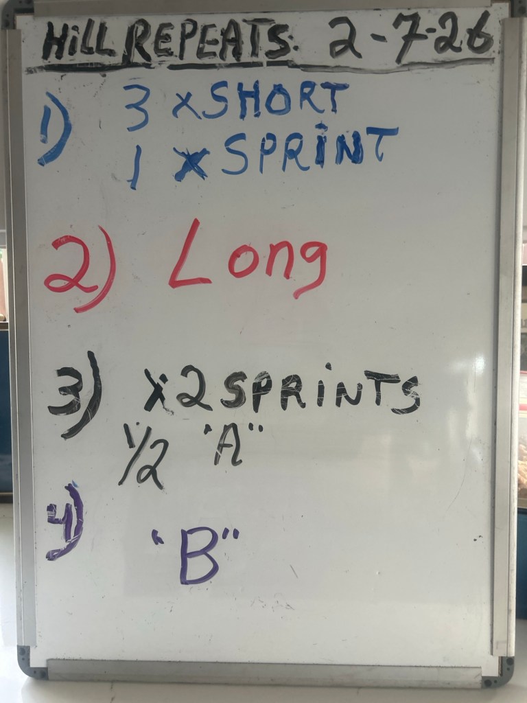 Looks like we’ll have better weather this week for our workouts and your training. Saturday HR/XT session may not be held to my having to work the finish line for the Tamalpa TCRS first race of 2026: Tennessee Valley 4M at 8 am.