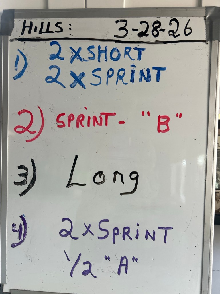 3/26/26 THURSDAY. SPEED-WORK at your local track. some of the group meet in dirt parking lot next to the PE Complex. They meet 8 am in the lot, run the warm-up mile; then meet at the track. Run 6 x 30 meters pick-ups, skips, butt kicks 2 x 100 meters ( 100). . The 800’s will be run at 5K – 5M pace (the reps add up so don’t go out too quickly).