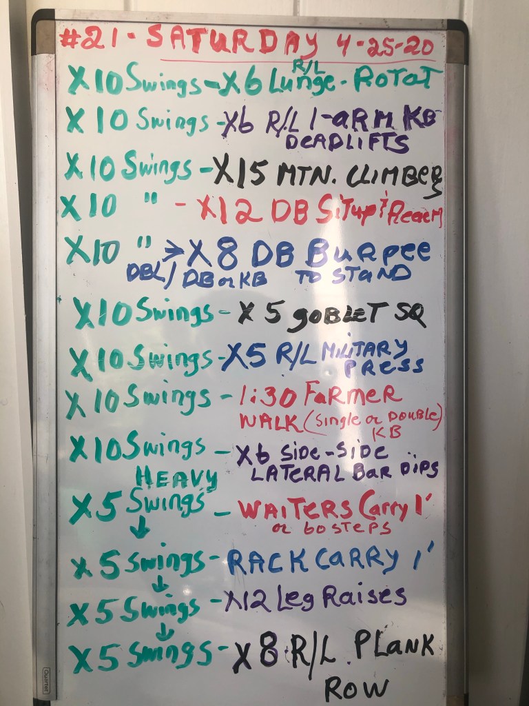 4/20/20 MONDAY …Adding Swings plus some additional exercises. If you are used to 100 reps add the extra swings as needed. WORKOUT #19