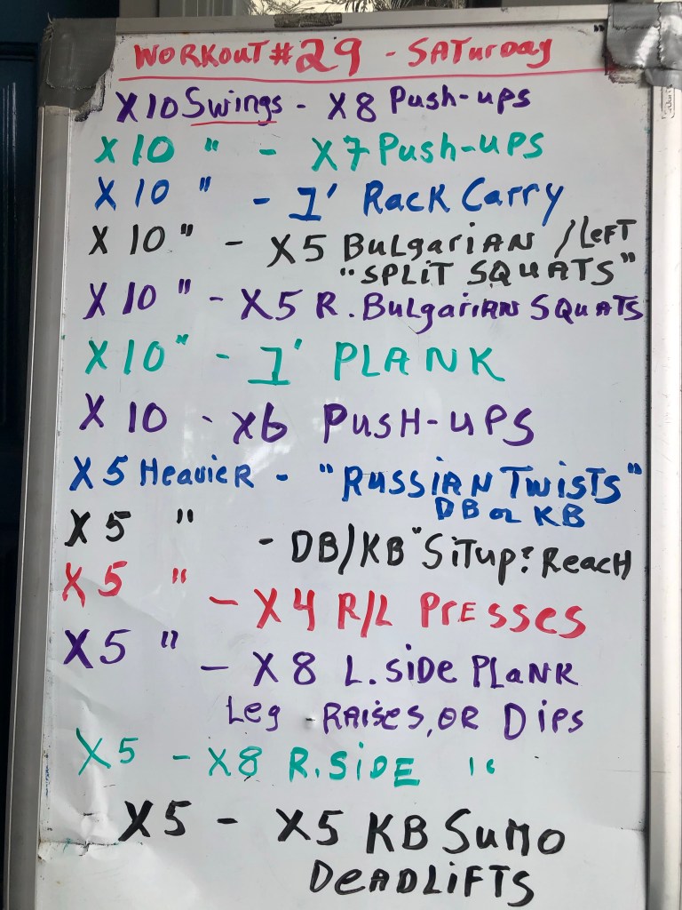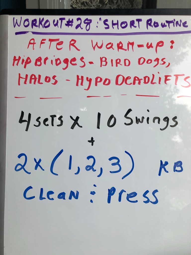 x 10 Swings / x 5 Halos; x 10 Swings / x 15 Goblet squats; x 10 Swings / 60″ or 60 step Rack Carry; x 10 Swings / x 8 KB Deadlifts; x 15 Swings / Standing R/L Standing Presses; x 20 Swings / 60″ or 60 steps Farmer Carry; x 10 Swings / x R/L KB or DB 1- arm rows ( the exercise that is like “sawing wood” while kneeling one leg on exercise bench or leaning on a support about knee level.
