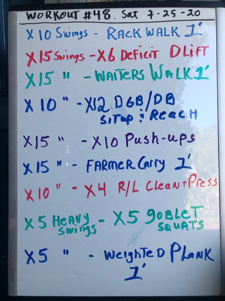 7/25//20 SATURDAY. STRENGTH and /or HILL REPEATS workout. WORKOUT #48. This is a bit shorter workout with the key lifts and carries you should be well familiar with and part of your arsenal of productive lifts. I will always be rotating more exercises in future workouts.