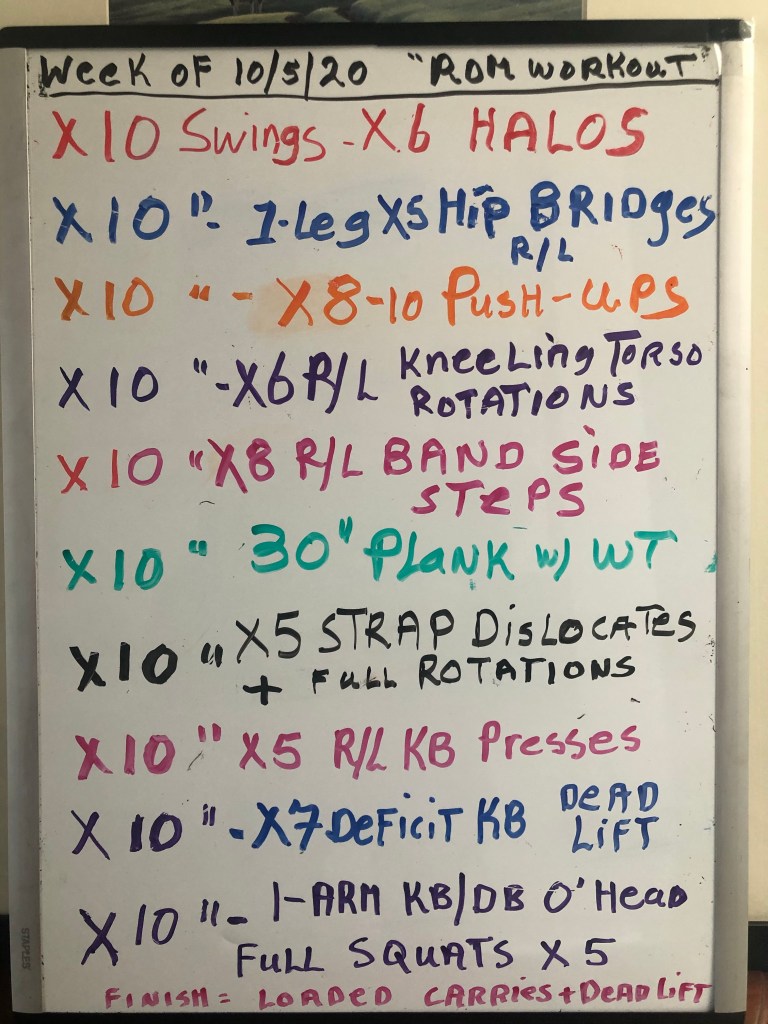 10/7/20 WEDNESDAY. STRENGTH TRAINING. A little bit of a change for this week by including more ROM exercises; you’ll still finish with Loaded Carries and Trap Bar Deadlifts.