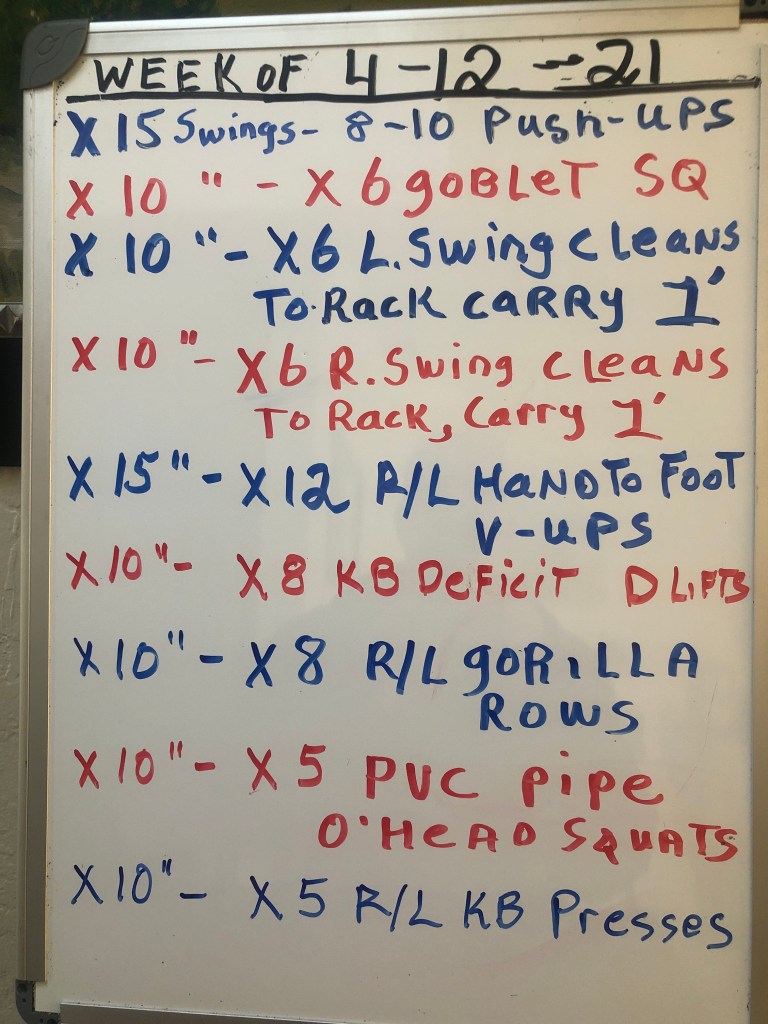 Notes on the workout: with the X6 Left Hand Cleans followed immediately with a left arm carry of 1-2 minutes. The goal here is to learn to brace the kettlebell with your lats instead of holding it up with arm and shoulder. The longer walk gives you time to practice brace/hold the bell in place with your lat support.Do the same on the right side.