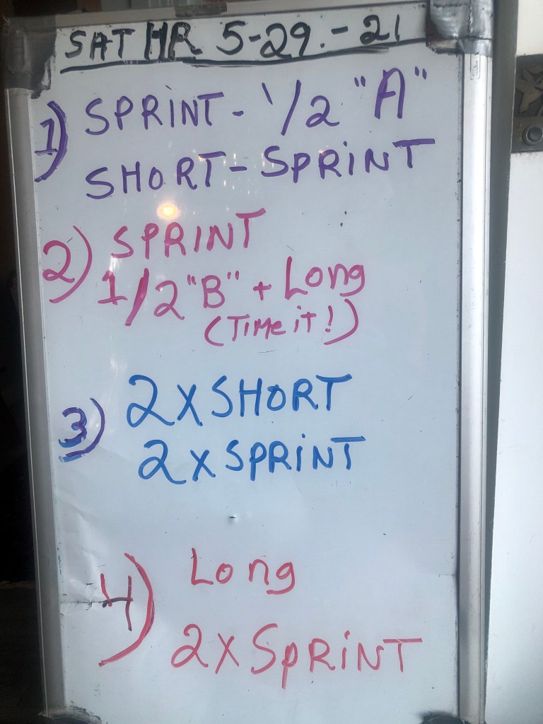 5/27/21 THURSDAY. TRACK workout. After warm-up run, 6 x 30 meter pick-ups, 4 x 100 (100), 4 x 150 (50):