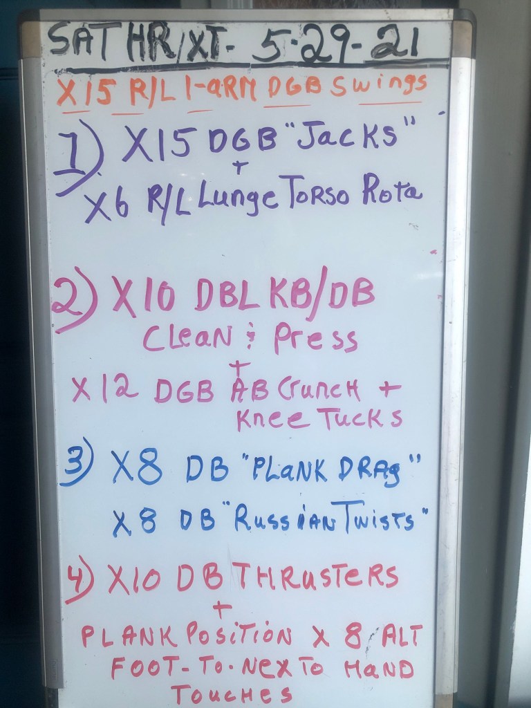 2). X 10 DBL DB or KB Clean & Press….and….X12 DGB Ab Crunch & Knee Tucks