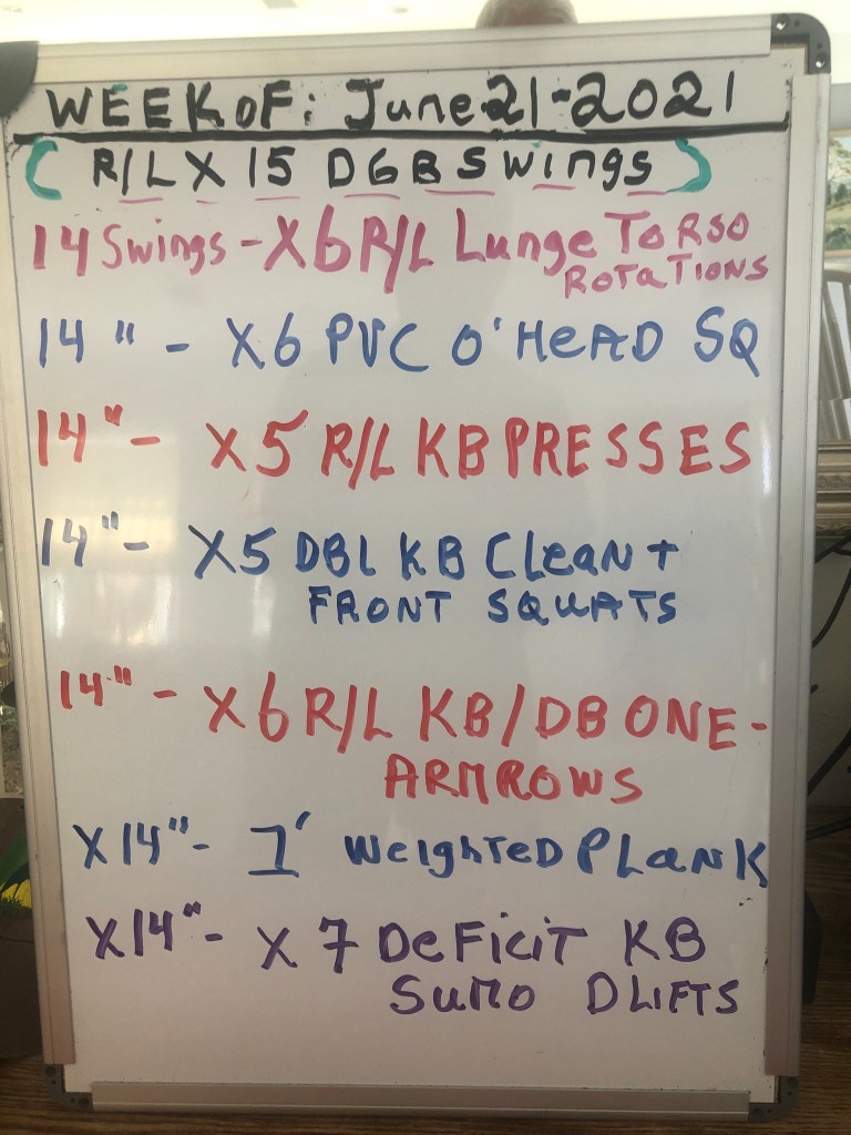 6/30/21 WEDNESDAY. STRENGTH Training sample for this week that as usual includes a hinge movement, something overhead, squat move, core strengthening and trap bar finisher. All members gradually work up to a trap bar deadlift with bodyweight.