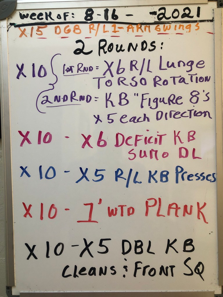 8/18/21 WEDNESDAY. STRENGTH workout for this week. You’ll do TWO ROUNDS , go through the five exercises; then repeat the sequence. You’ll finish with Loaded Carries and Trap Bar deadlifts. First get in some Halos, Goblet Squats and hip raises.