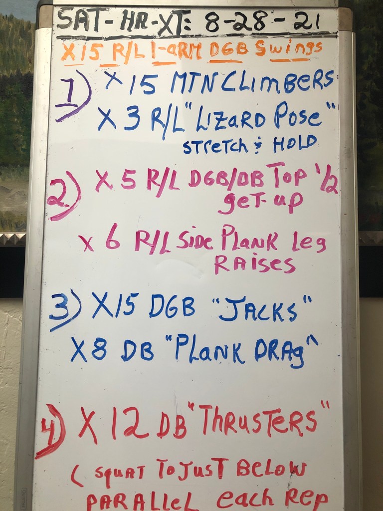 8/25/21 WEDNESDAY. STRENGTH TRAINING. You’ll get in your Halos, a few Goblet Squats, strap shoulder dislocates; then X 15 R/L one-arm DGB ( or a light kettlebell) Kettlebell Swings. You will be able to better emphasize the Hip Hinge movement, hip snap with the DGB which you apply to regular kettlebell swings.