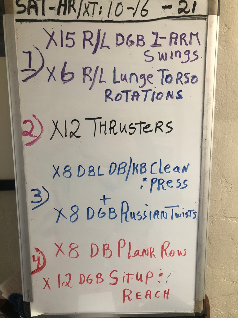10/13/21 WEDNESDAY. STRENGTH TRAINING. After the warm-up Halo rotations around the head with a weight plate, DB or KB; hip thrusts, shoulder rotations and dislocates; and a set of light full range 5 Goblet Squats you’ll begin the workout. I suggest that on another day to simply get in 3 R/L Turkish Get Ups to improve mobility, core, balance your right and left sides, and connect upper and lower body. ….Start with 5 x 12 Swings OTM (On The Minute).