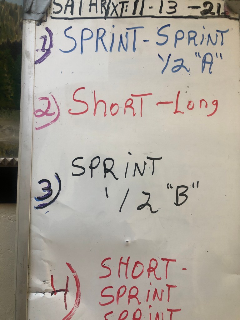 11/11/21 THURSDAY. SPEED-WORK preferably at a track. Leg speed for the 5K. After the usual warm-up run, 6 x 30 meter pick-ups, some skips and butt-kick; do 2 x 100 (100) stride-outs, do: