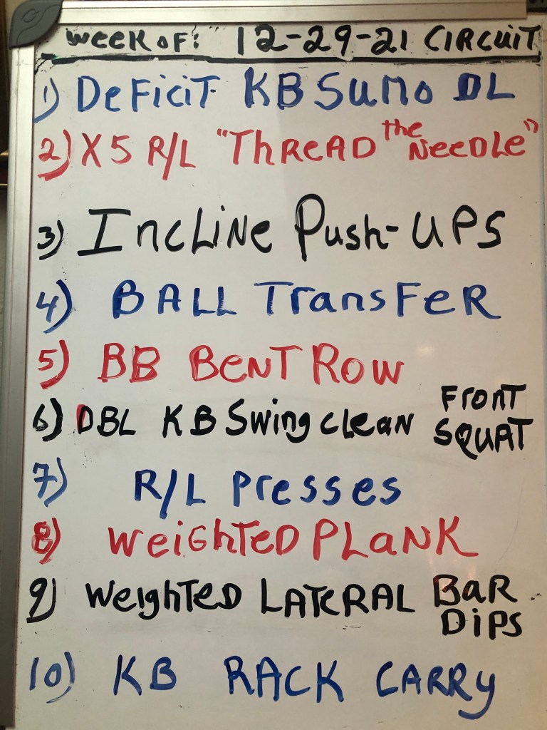 12/29/21 WEDNESDAY. STRENGTH TRAINING CIRCUIT. After a warm-up with Halos, Goblet Squats, Hip Raises: