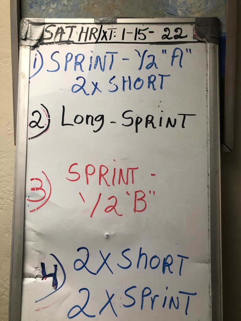 1/13/22 THURSDAY. SPEED-WORK on track. After the warm-up mile, a few drills, 6 x 30 meter pick-ups do Two Rounds run through: (2 x 150 (50) – 1000 @ 10K pace (200) – 600 @ 5K pace (200) – 400 (200))