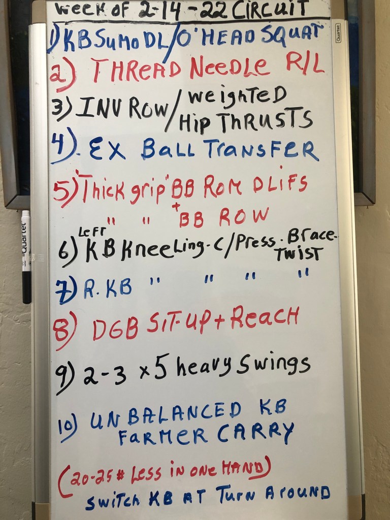 2/16/22 WEDNESDAY. STRENGTH TRAINING CIRCUIT. We regularly include a hip hinge, squat, press and deadlift movements in the workout.