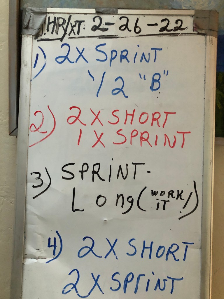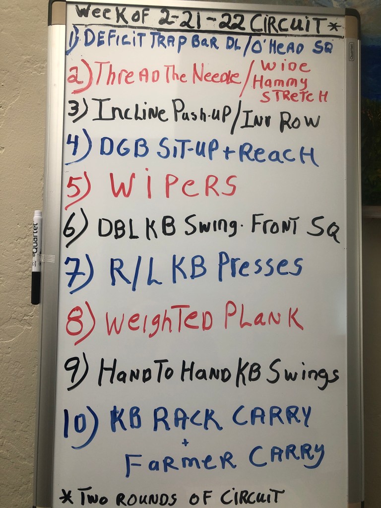 2/23/22 WEDNESDAY. 8:15 am at Warren’s.STRENGTH TRAINING CIRCUIT and Trap Bar Deadlifts 3 x3 finisher. Circuit is 35″ of the exercise / 25″ to move to next station plus partial recovery.