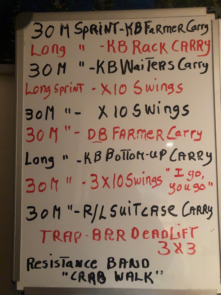 X5 Trap Bar Deadlift or with KB; X5 R/L KB /DB Presses, 12 Swings, and X6 to each side DB “Plank Drag”