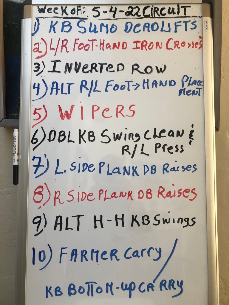 5/4/22 WEDNESDAY. STRENGTH TRAINING CIRCUIT. 8:15 AM start. Held at Warren’s. I may have us do one round of the Circuit; then work on the Get-Up…