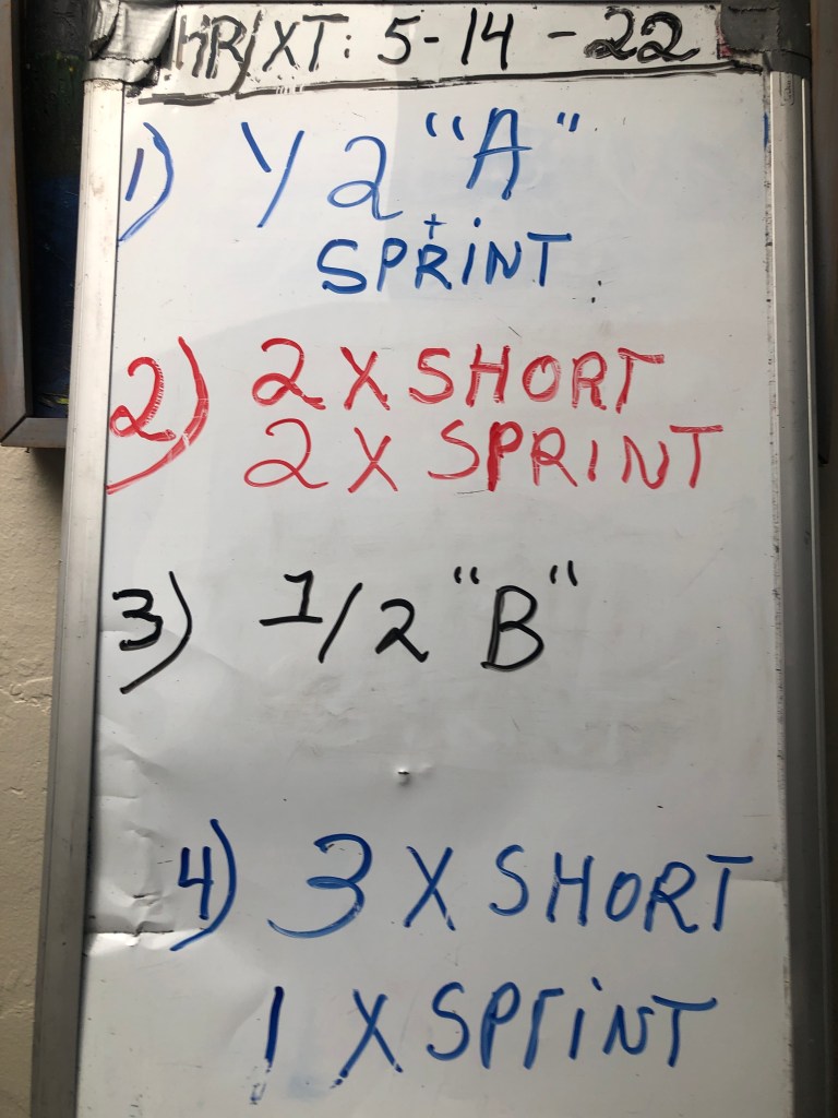 5/10/22 TUESDAY. TEMPO. Build that high aerobic threshold pacing ability to help insure success to hit your PR’s in races. After the warm-up mile, hold a steady “comfortably stressed” pace for 8′ (3′ easy running) – 6′ T (2′ easy) – 4′ T (easy running and continue to finish).