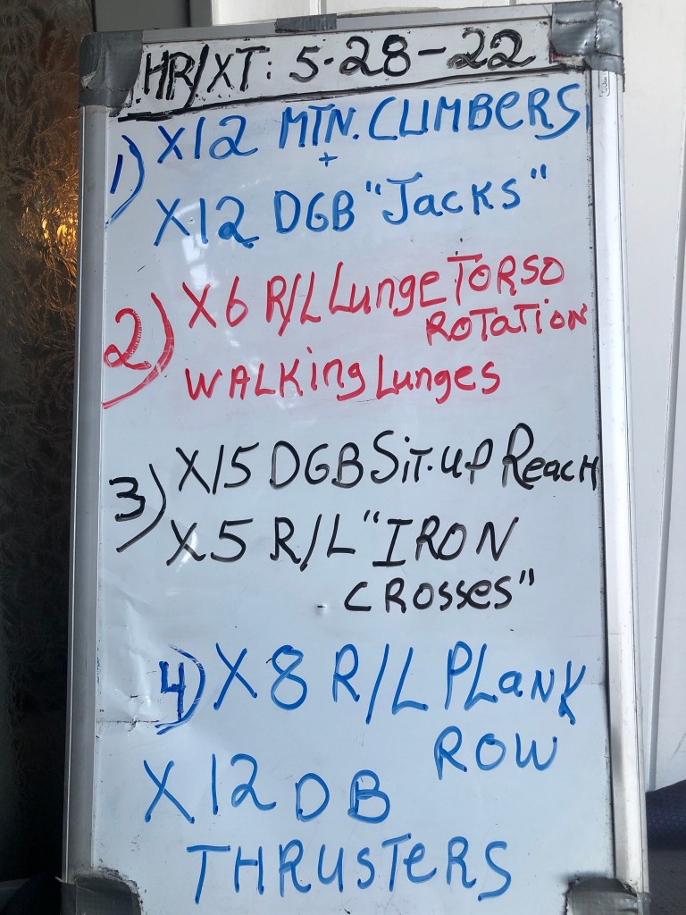 5/25/22 WEDNESDAY. STRENGTH TRAINING. 8 AM at Warren’s gym. To day, we’ll go over the recently details of the kettlebell clean, clean and press. We’ll warm-up with mobility exercises and 5 x 12 Swings prior to working on the Cleans.