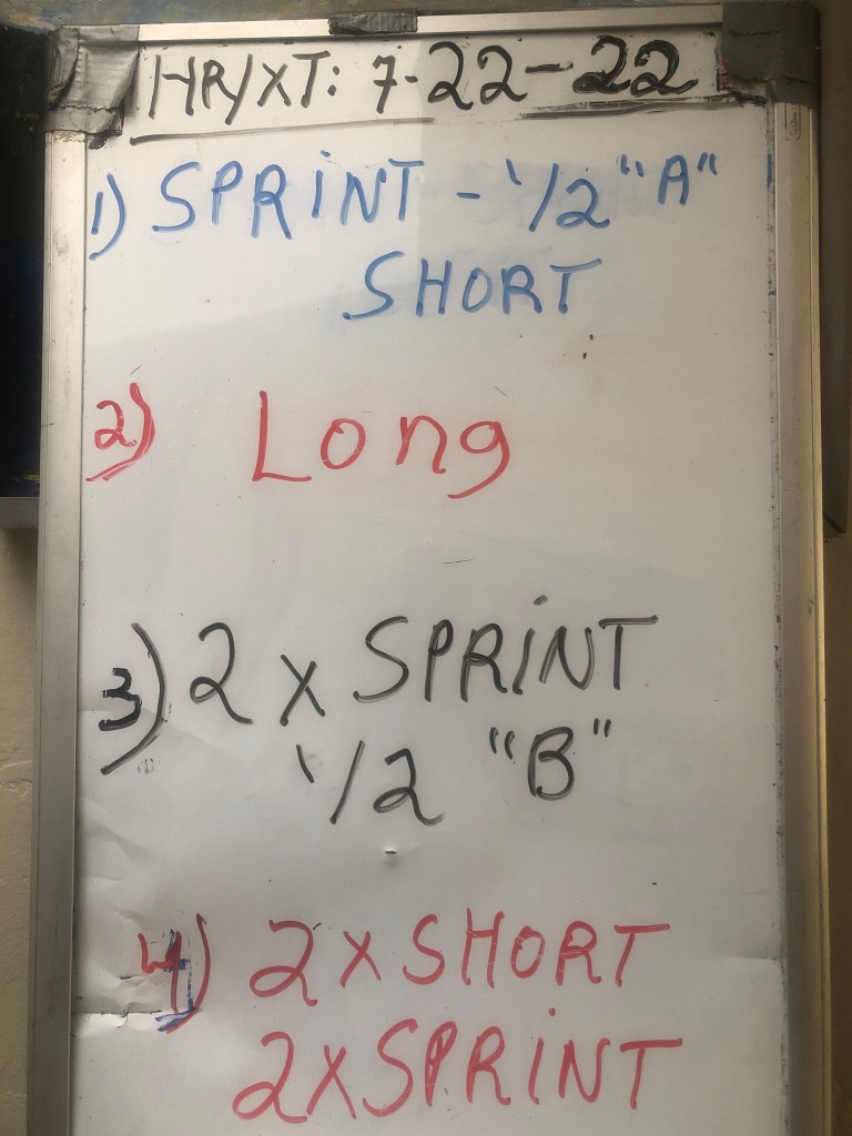 7/21/22 THURSDAY. SPEED-WORK at your local track. After the warm-up run, 35 jumping jacks, 6 x 30 meter pick-ups, 10 free squats; run 2 x 150 (50), then: