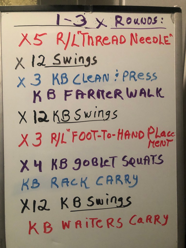 (X25 Jump Rope, X 15 Swings, X 4 Goblet Squats, X6 R/L Renegade (plank) Row, X 10 DGB or DB Sit-Up & Reach)