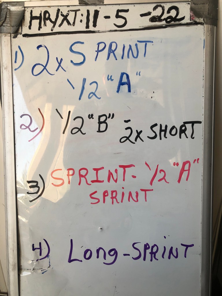 11/3/22 THURSDAY. SPEED-WORK at your local track. Warm-up miles, Skips & Butt Kicks, 6 x 30 meter pick-ups. Ladder down workout. As you go down the ladder run each set a bit faster. The 1000 at 5M pace, 800 & 600 at 5K pace; and the 400 faster than 5K pace and finishing with the 200’s at mile pace.
