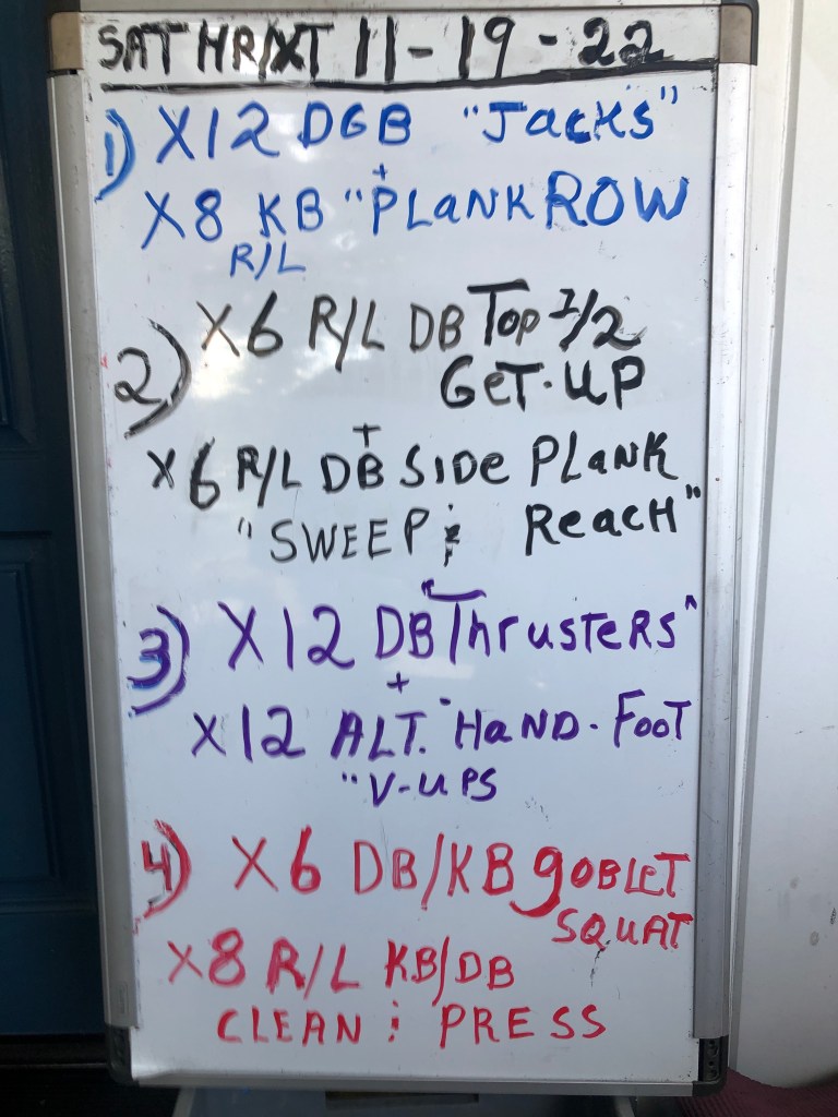 SATURDAY, 11/19/22. 8 AM – 12 PM Kettlebell 101 Workshop: focus is on the KB Swing and Turkish Get Up. You will get help with all the details of those two movements that make up the core of KB training along with Goblet Squat, Clean & Press, Snatch and Deadlift. Go to http://www.oaklandsmostpowerful.com to get the details and sign-up ($125); you’ll be receiving plenty of one on one help. It’s a quick freeway drive to the gym’s outdoor exercise space with overhead tarp and rubber flooring. …..Meanwhile I’ll be holding our regular Sat workout.