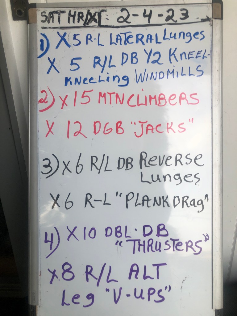 2/1/23 WEDNESDAY. STRENGTH TRAINING CIRCUIT / SWINGS/TRAP BAR DEADLIFTS. 8:15 AM at Warren’s gym. Arrive a bit earlier to carry out mobility exercises and warm-up. First 5×12 Swings followed by two rounds of the circuit:
