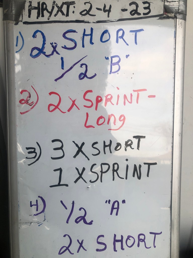 2/2/23 THURSDAY. SPEED-WORK at your local track. After the warm-up mile, running drills, 6 x 30 meter pick-ups, 2 x 150 (50): then 6 rounds of: