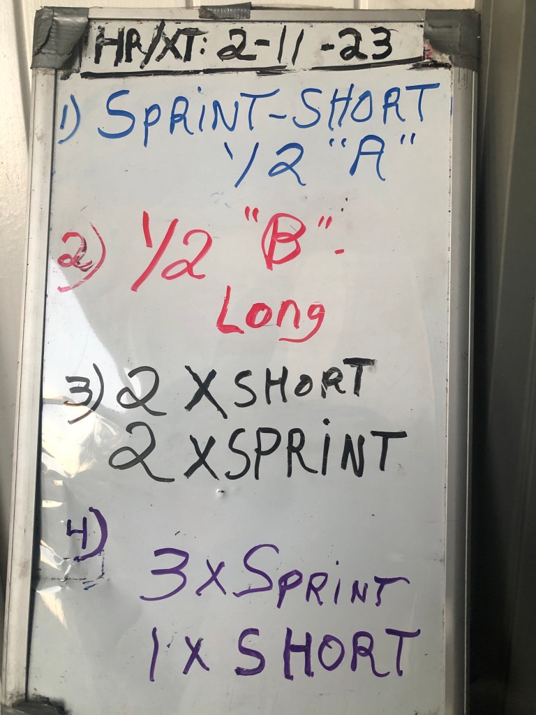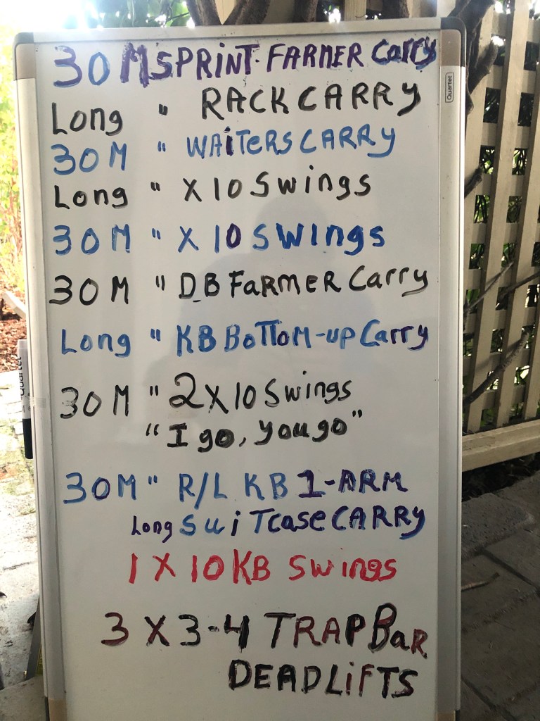 Then it’s on to the second half of the workout: loaded carries, swings, sprints, trap bar deadlifts white board to be posted