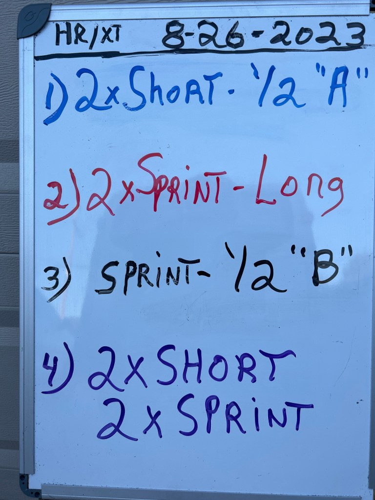 8/24/23 THURSDAY. SPEED-WORK at your local track. After the warm-up mile, skips, 6 x 30 meter repeats, 2 x 100 (100), you’ll do 3 rounds of: