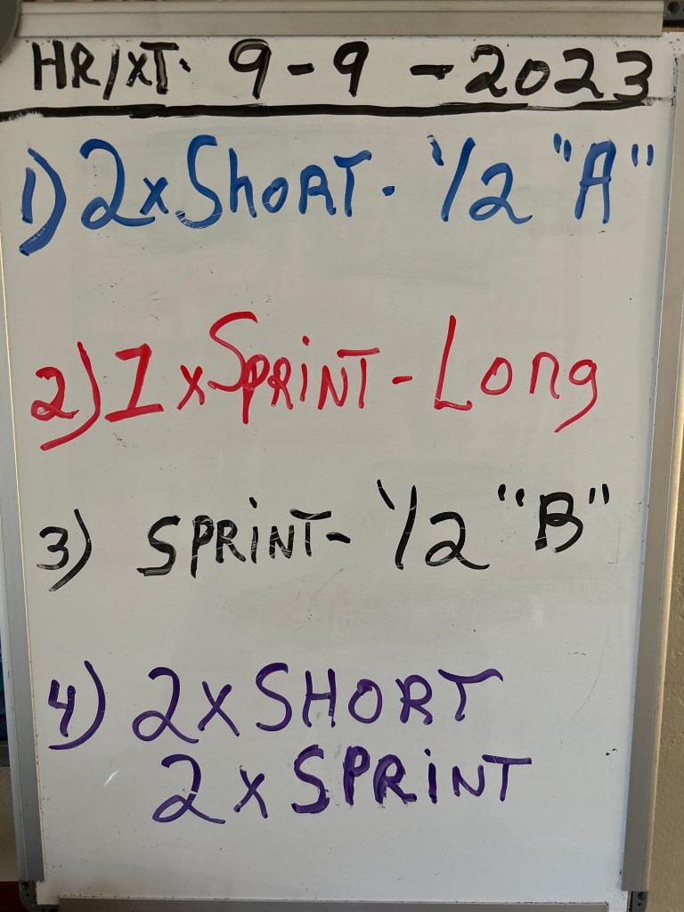 9/7/23 THURSDAY. SPEED-WORK at your local track (sorry, about the missed post for this; it went to wrong site). After the warm-up mile, 6 x 30 meter quick cadence pick-ups, skips, butt kicks and 2 x 100; you’ll do TWO rounds: