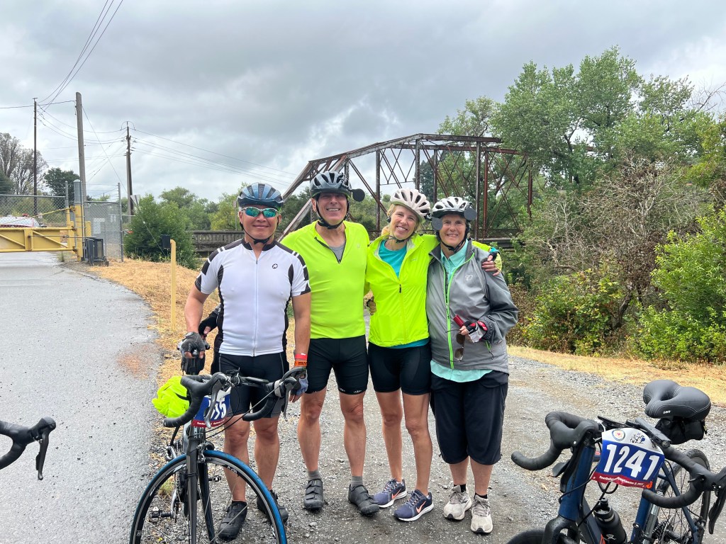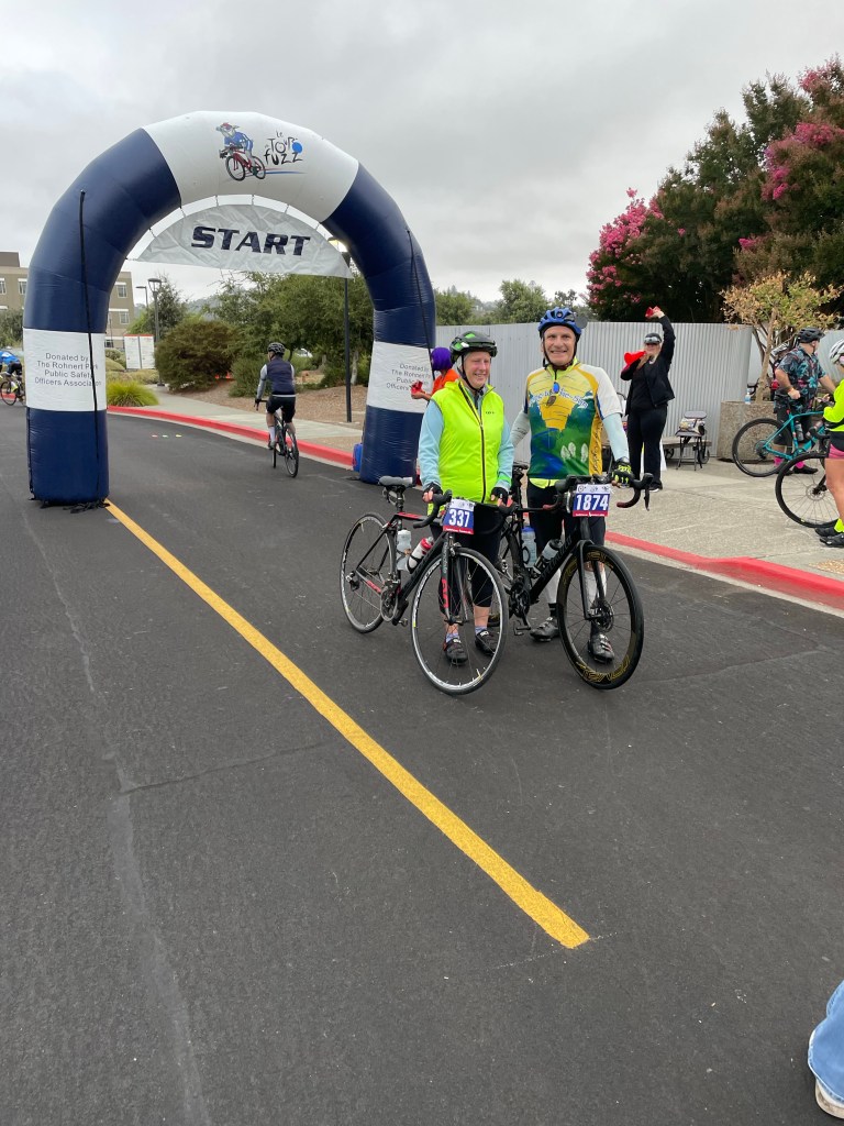 A number from our workout group had an interesting Tour de Fuzz 50K & 100K ride last Saturday: had rain four times during the ride which was a bit unexpected. But for most of the ride we had pleasant weather – better than hot conditions! The courses wind through the Russian River Wine Growing Region of the Healdsburg, Geyersville, Santa Rosa area. The rides were followed by a good lunch for all the riders with BBQ’ed chicken, penne pesto pasta, salads, baked beans, rolls and ice cream for dessert. A good day for all.