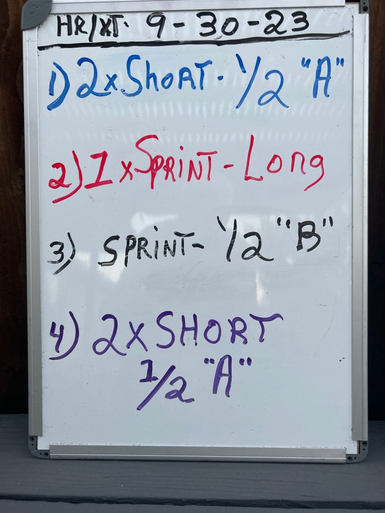 9/28/23. SPEED-WORK at your local track. After the warm-up mile, 6 x 30 meters, 2 x 100 (100). Then TWO rounds: