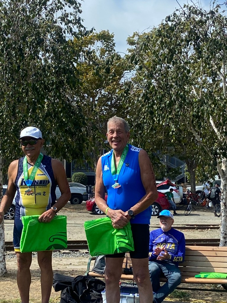Results: Kevin and Dave participated in the Santa Cruz Sprint Triathlon last Sunday – and made it onto the podium! Thank goodness for age group competition and various length triathlons: something for every level triathlete. One doesn’t have to do the Ironman distances or even the 70.2 (half ironman distances; perhaps you’ll have more fun competing in the Olympic and Sprint distances. The event was well-managed and a blast to compete in! I’ve simply enjoyed doing the triathlon as a workout because the three disciplines gave me a nice all around complete fitness experience.