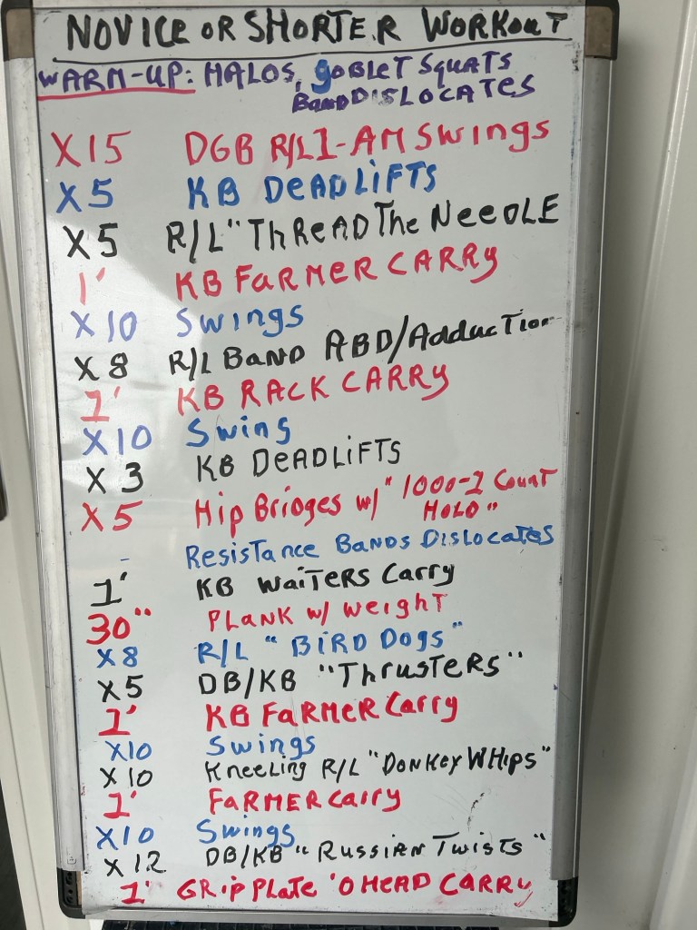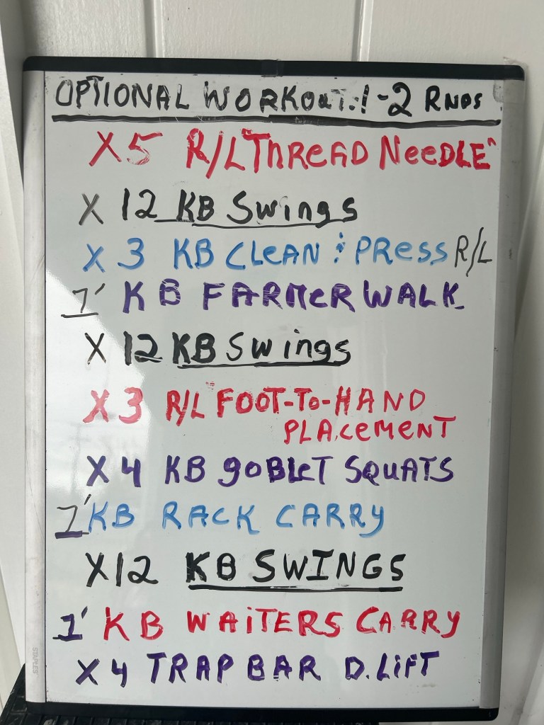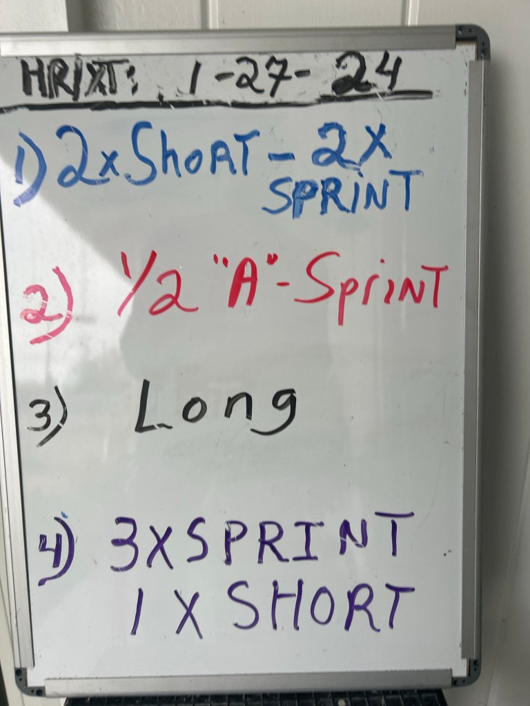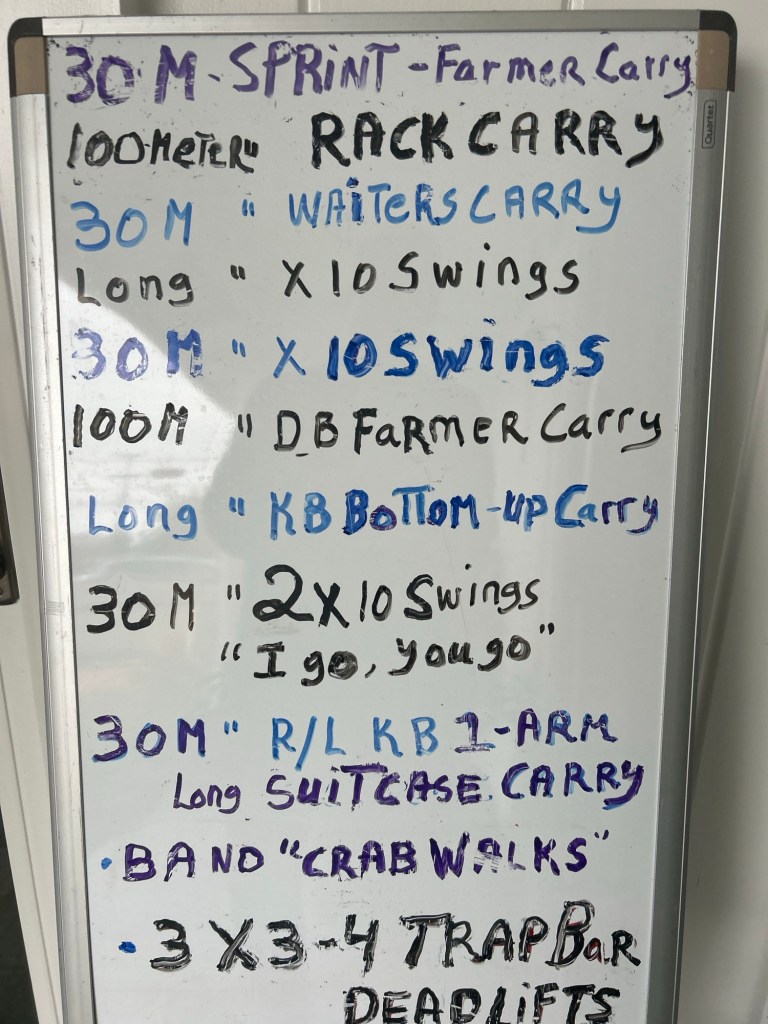 Then it is on to second half of workout with next White Board listing Carries, Sprints, Deadlifts