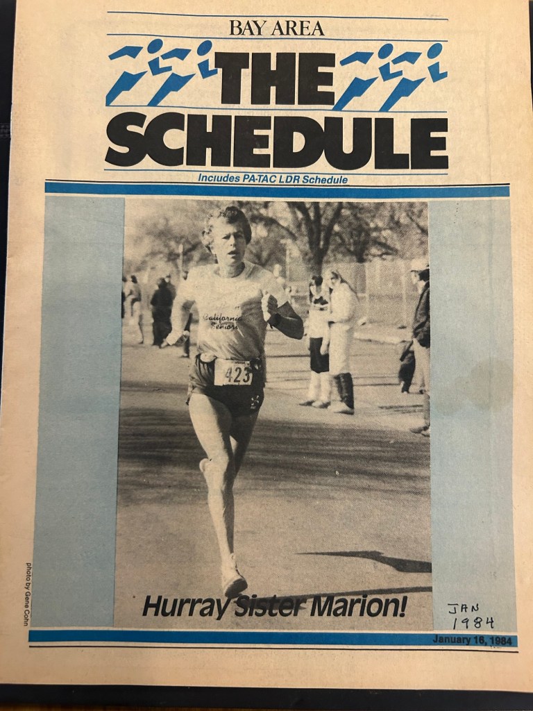 We’ll have a shorter workout week together, but you’ll still continue with the TH track session and your own program Friday and Saturday. Sandy and I will be leaving Thursday for Spokane to celebrate our grandson’s birthday, watch him play in a basketball tournament and get to see my daughter after they drove in from Montana. Then, as a last minute addition, Sandy and I will be driving down to Olympia, Washington to join Sister Marion at the 40th Reunion of the First Women’s Olympic Marathon Trials where Joan Benoit and Sister Marion will be featured speakers. It will be quite the occasion where we share many memories from the 1984 event week. Accompanying assisting Marion will be good friend and fellow Trials qualifier Leslie McMullin. The Olympic Marathon Reunion Committee is doing a terrific job putting this reunion together and it will be a memorable one for each of those runners who ran that day 40 years ago. I include picture of Marion running the Stockton 10 Miler ( I have to find the full name : Frank____ 10 miler), where she ran like a 61 minute time…more to come..