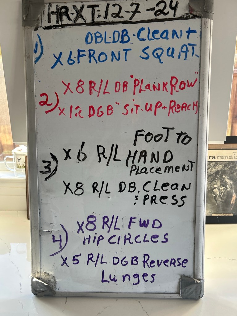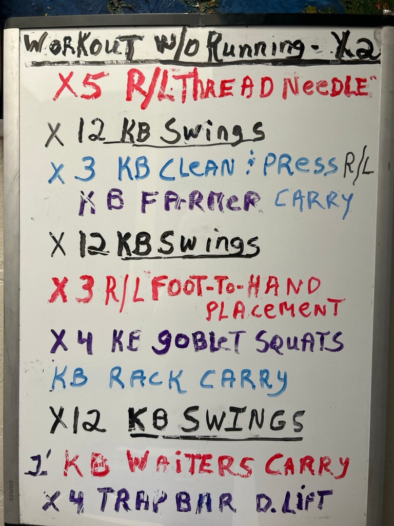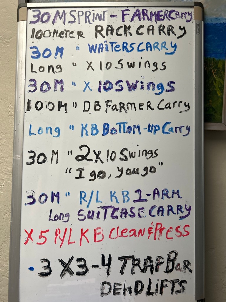 12/4/24 WEDNESDAY. STRENGTH TRAINING CIRCUIT/ SWINGS/CARRIES/DEADLIFTS. 8 AM at Warren’s gym. After 30 Jumping Jacks, get in your mobility warm-up and then 50 KB Swings. Two rounds of the Circuit.