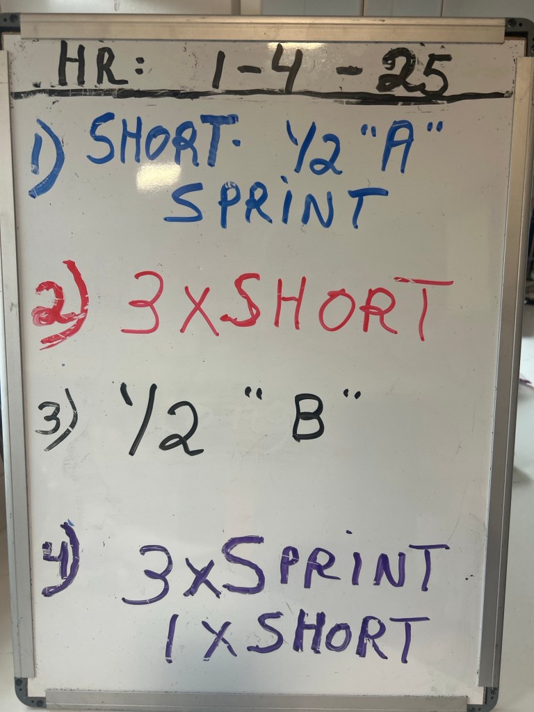 1/2/25 THURSDAY. SPEED-WORK on your local track. After the mile warm-up you’ll get n 6 x 30 meter pick-ups with quick leg turnover; do some Skips and butt-kicks. This week we’ll pause your 400 repeats due to the Holidays and you’ll do a lower volume and shorter intervals.