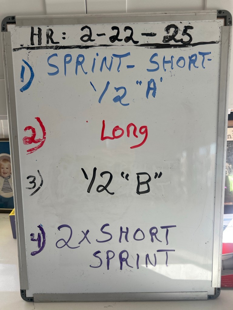 2/20/25 THURSDAY. SPEED-WORK at your local track. After the warm-up mile, 6 x 30 meter quick cadence pick-ups. Then: