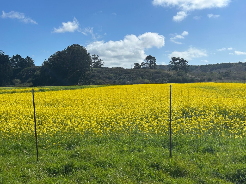 The ride in the southerly direction was especially beautiful this time with the miles of oxalis yellow flowers, mustard, and canola on both sides of the Highway One: the vibrant yellow stretched in large swaths against a background of green. This is the time to see coastal route so colorful after all the rains. Cars were also pulling to the side of the road just south of Half Moon Bay to walk in and stand in the many acres of mustard plants taking photos of the intense yellow growth: absolutely stunning display Nature at its best! (Some photos to follow.)